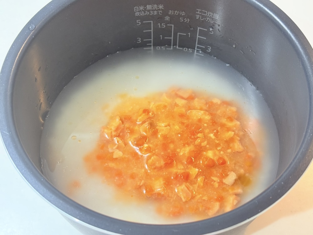 お米を研いで水をいつも通りの量入れたら、具材を投入!