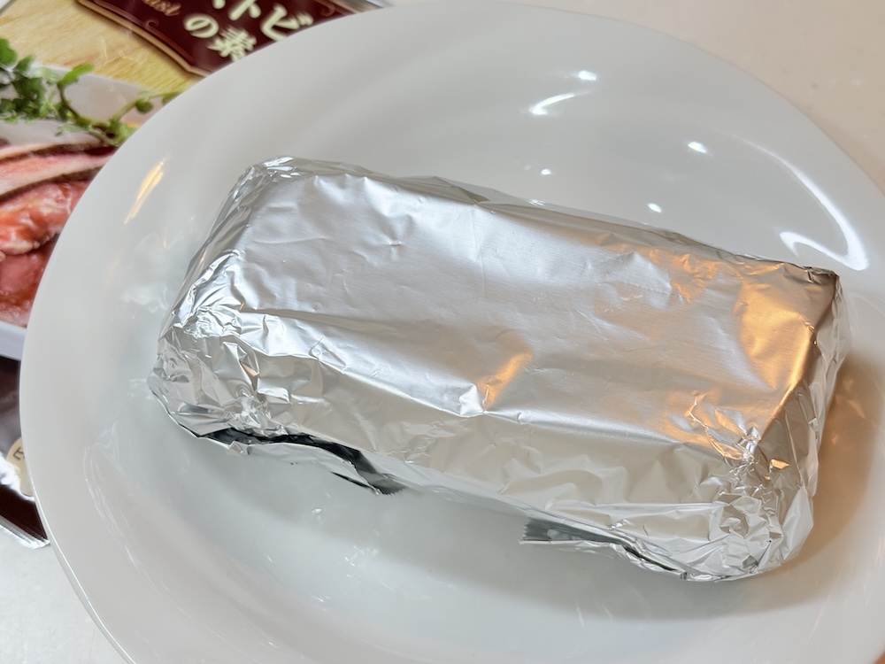 アルミホイルで牛肉全体を包み、20〜30分置いて余熱で火を通します。