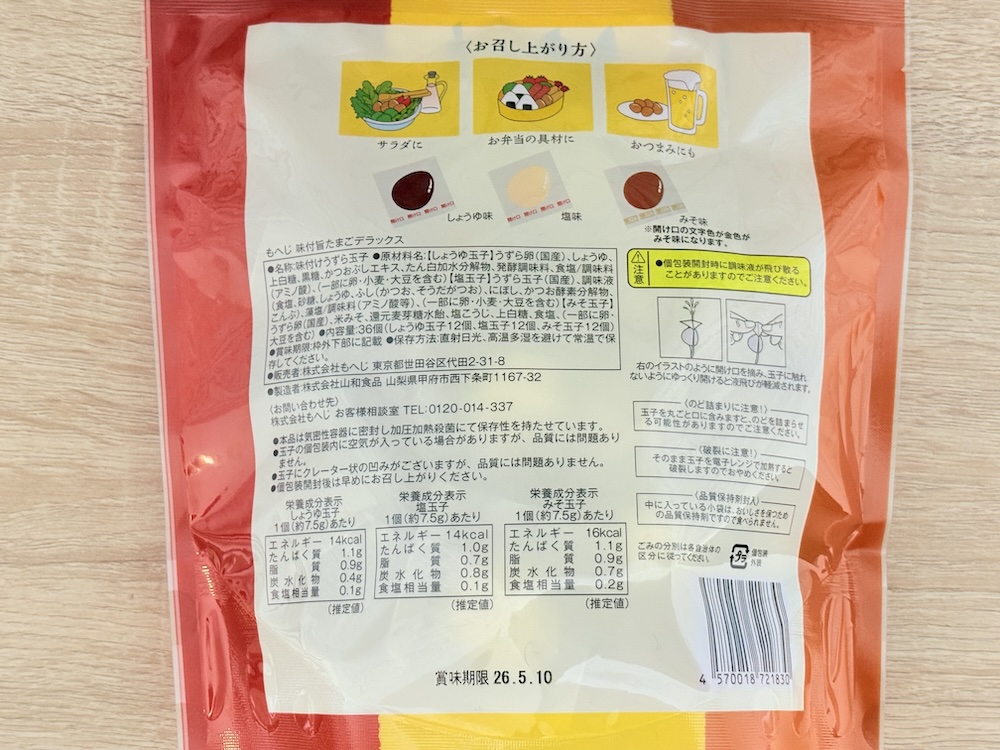 今まで「味付旨たまご 12個」という醤油味のみが入った商品や、「味付け旨たまごミックス 26個」という醤油味と塩味がミックスされた商品が販売されていましたが、デラックスには味噌味も追加!