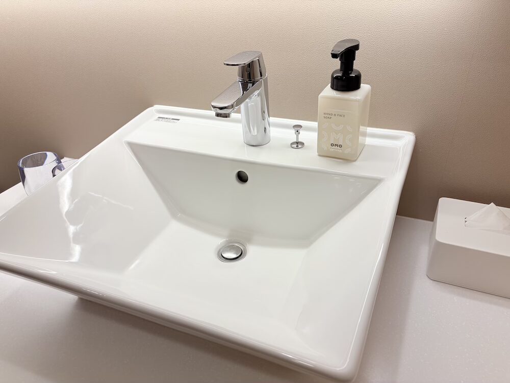 洗面台はよくあるタイプで、ハンド&ボディソープ、コップ、ティッシュなどが上に置いてあります。