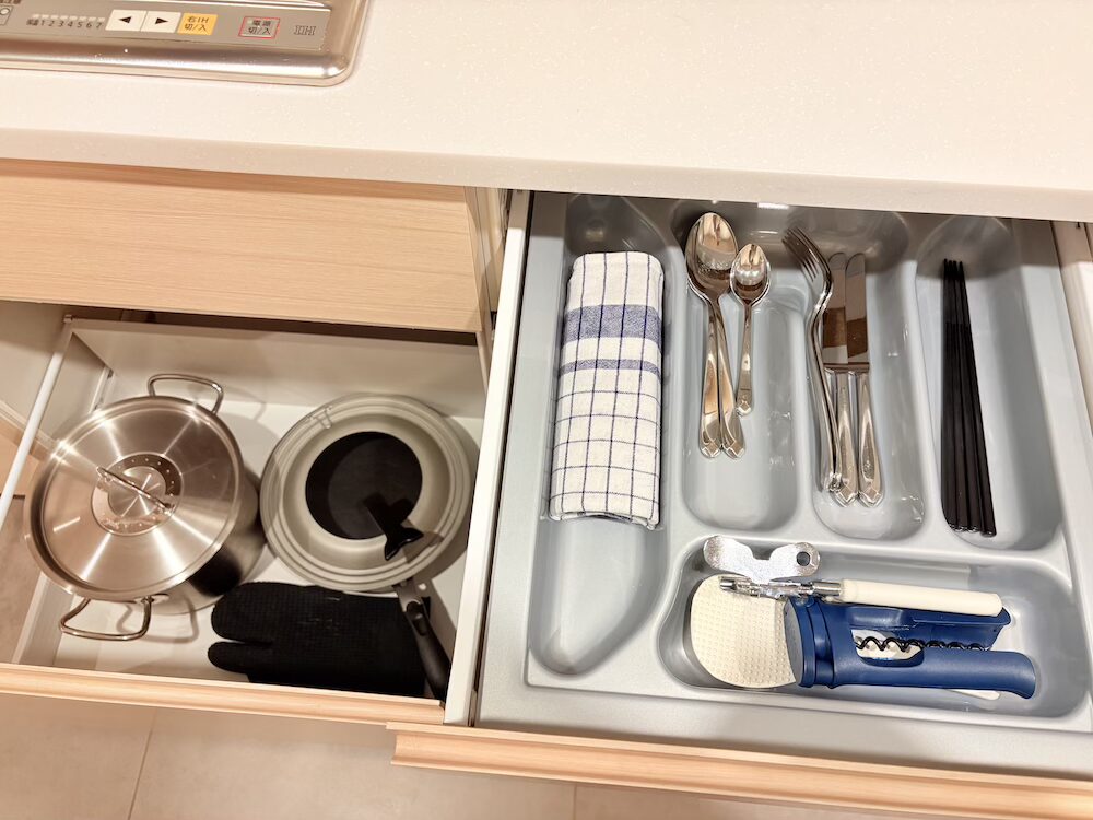 上の引き出しにはカトラリーや栓抜きなど、下の引き出しには鍋やフライパンが入っていました。