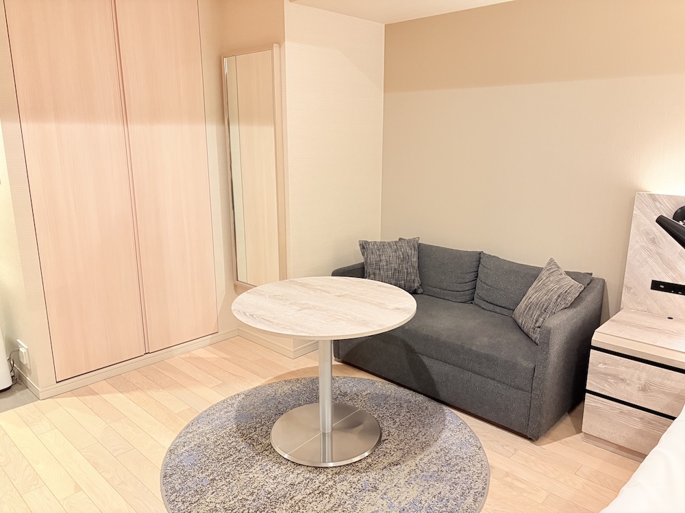 ベッドルームの隣にはソファやテーブルなどがあるので、お部屋で食事をする場合はこちらが活躍しそうです。