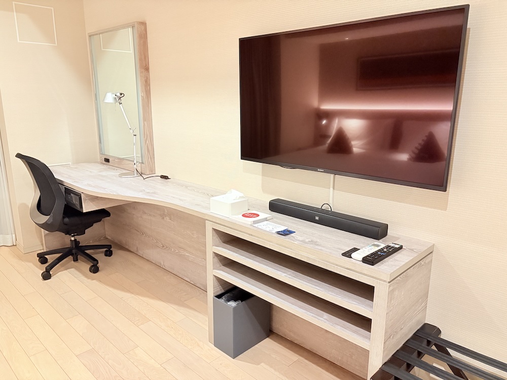 ベッドの向かいにはこれまた広々としたデスクがあり、テレビもそこそこのサイズ。