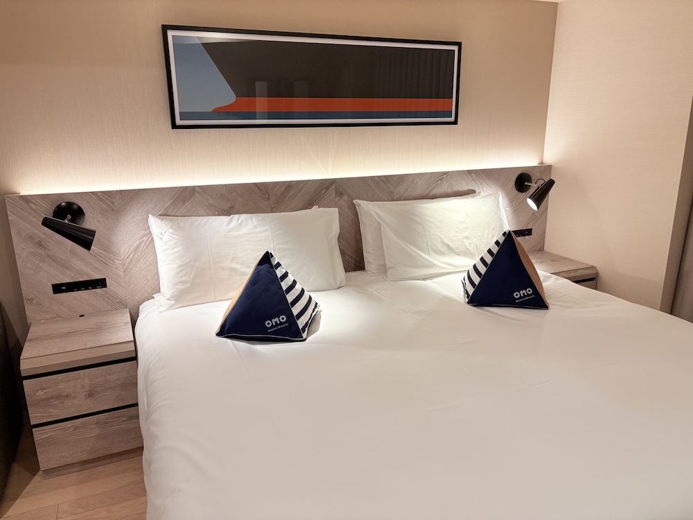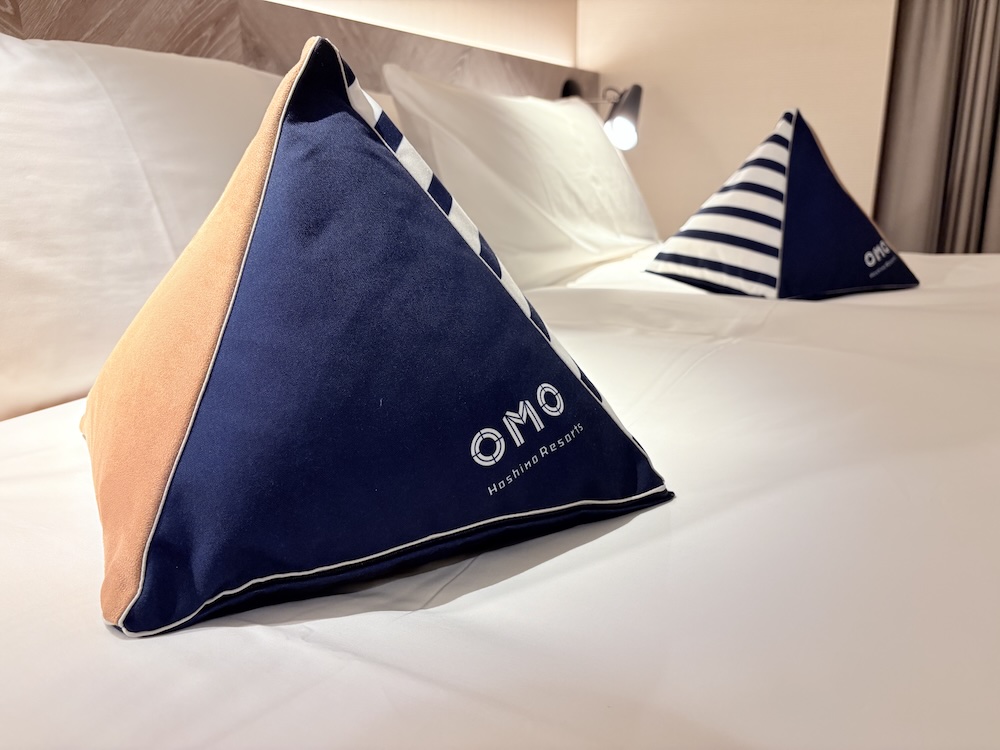 ベッドの上にはお馴染みのOMOクッションが置かれていて、OMOファンはここでテンションが上がる方も多いはず。
