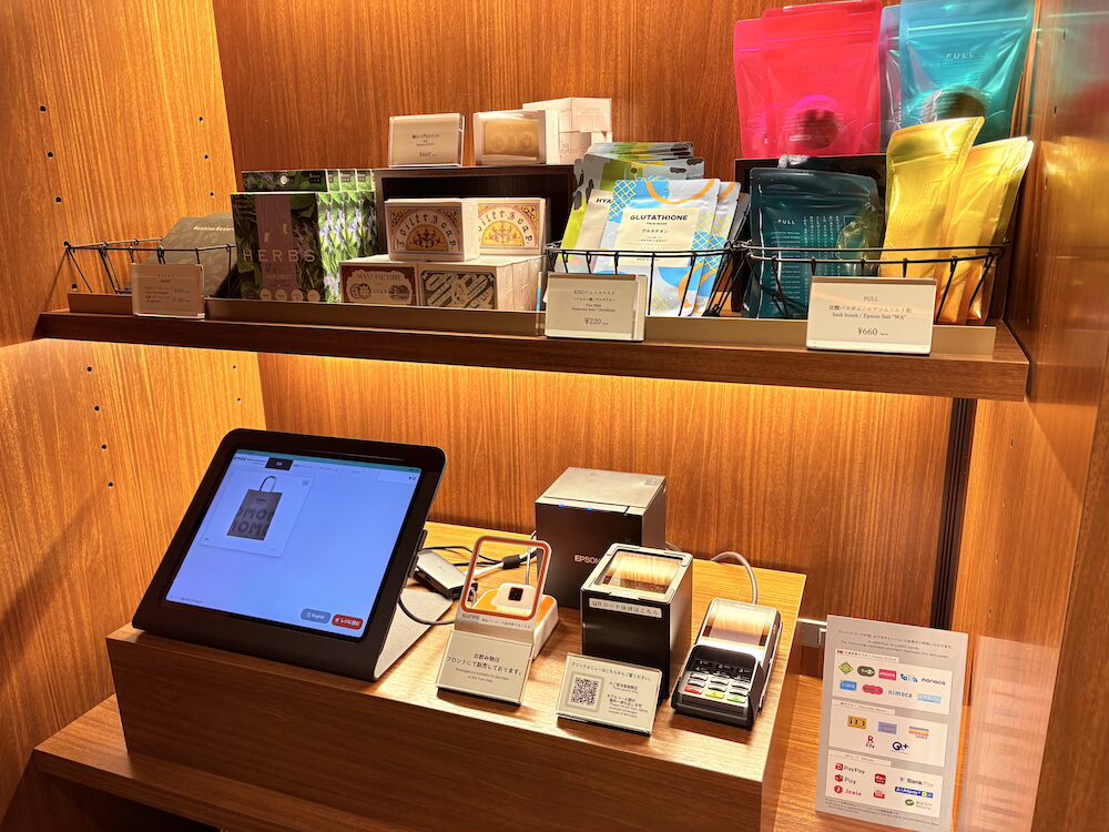 キャッシュレス専用のセルフレジとなっており、この他フロントにてドリンク類も販売されているようです。