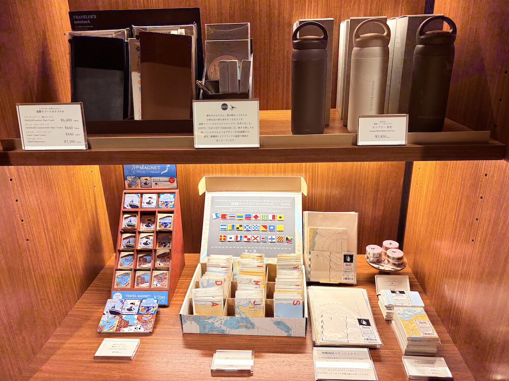下段には旅の思い出に持って帰りたくなる横浜デザインのマグネットや海図デザインの文房具が置かれています。